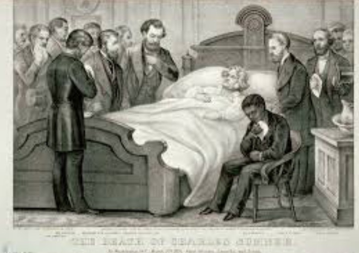 Sumner’s funeral was said to be a thing to behold here in Boston. His body was carried from the State House to King’s Chapel for services and then all the way across the river, past Harvard to Mount Auburn Cemetery to be interred. His mourners followed the casket on this five mile journey, and legend has it that when Sumner’s body entered Mount Auburn, the last mourners were just leaving King’s Chapel.