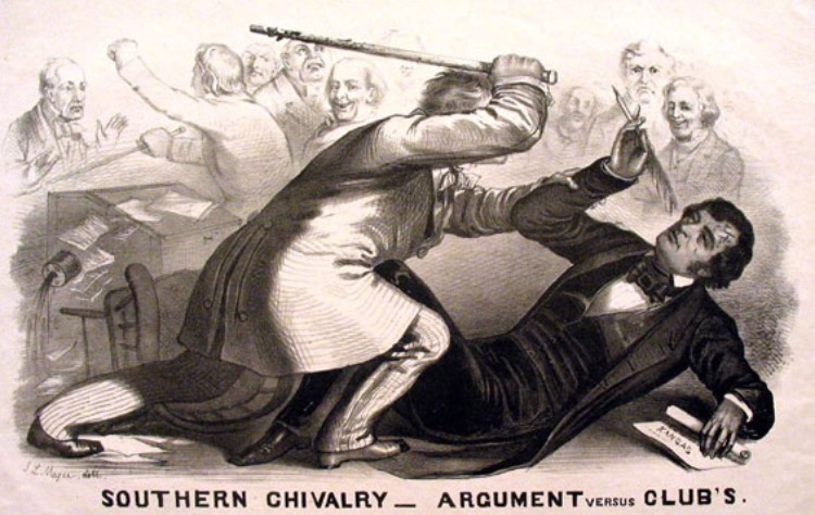 The outright violence that took over Kansas at this point inspired Sumner, on May 19th and 20th, 1856, to deliver one of his most famous speeches, “The Crime Against Kansas.” This scathing oratory spanned five hours over two days and seriously offended all of the Southern delegates, most especially one of the Congressmen from South Carolina, Preston Brooks.