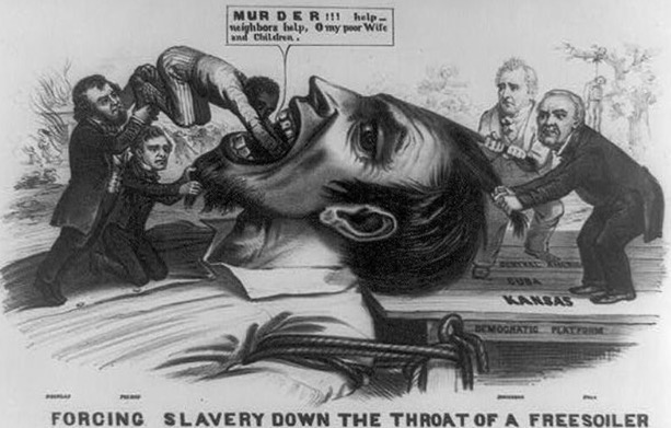 In 1854, another controversial act brought the tensions between the North and the South even closer to a head. The Kansas-Nebraska act overturned the Missouri Compromise of 1820 and encouraged ‘Popular Sovereignty” in new territories seeking to become states. Essentially, the Kansas and Nebraska territories were coming close to being eligible for statehood, and the free-state, slave-state balance was in jeopardy. Both territories clearly expressed free-state leanings, but the South would not give them up without a fight. Nebraska turned out to be too far north to be a good candidate for slave crops, and so the entire conflict moved to and settled in Kansas. The North was sending folks in droves to settle the territory, build hotels, churches and schools and to bolster the free-state vote when the time came for statehood. The South similarly sent folks in to sway the vote, though most of their representatives came from neighboring Missouri, not to settle permanently, but simply to exert enough influence to insure the Free Soilers did not prevail.