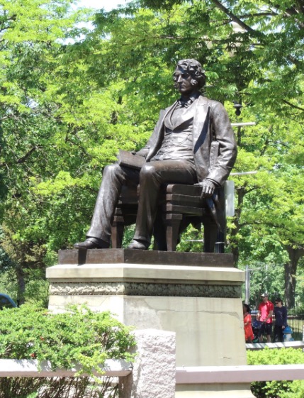 One year later, in 1875, Massachusetts decided to honor her great son by putting a statue of him in front of the State House in Boston. Now if you were paying attention at the start of this post, you probably noticed that I mentioned I usually talk about Sumner, not in Boston, but at Harvard. A blind contest was held to determine the artist who would create Sumner’s statue. All the hopefuls submitted their renderings without identification, and when the day came to select the winner, a woman stood up to claim the design. Her name was Anne Whitney, and the selection panel promptly told her that it would be “imprudent and improper for a woman to sculpt a man’s legs,” and therefore she was disqualified. They selected the runner up instead, whose statue of Sumner now stands in Boston’s Public Garden, near the State House. Anne Whitney waited 27 years and then finally decided to make her statue herself. The City of Cambridge found out about the project, raised enough money to buy it from her, and placed it in pride of place in front of the main gates of Harvard, where Sumner still sits proudly today, seen by more folks than walk past him in the Gardens.