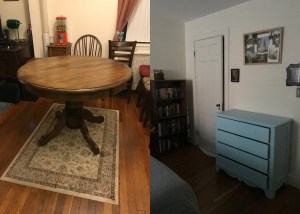 As part of the nesting, we decided it would be easy and fun to refinish some furniture! Well, the dresser was fairly easily stripped, sanded and repainted, but the table was a beast. It used to be completely black, now it is a simple, beautiful, stained mohogany. Can’t say we’re anxious to refinish any more furniture, but it was definitely a rewarding process! (And I had perhaps a little too much fun picking out knobs for the dresser…and our kitchen cabinets.)
