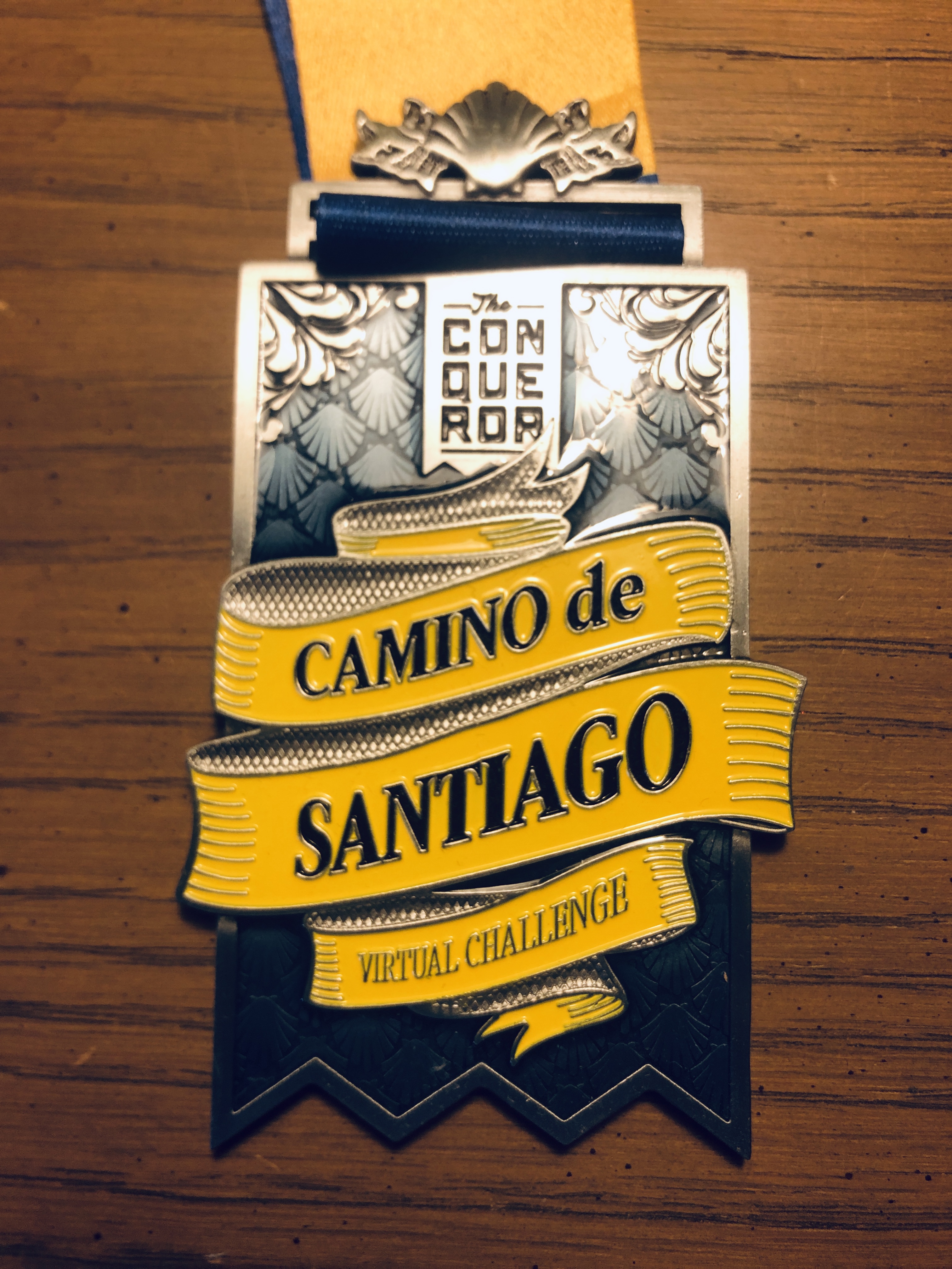 Reading Two Steps Forward reawakened that deep desire in me to take my Camino. But 2020 was obviously not the year to go trekking in Spain. As I was dreaming on the internet, though, I did find a fitness company that sells motivation in the form of various virtual global treks. Pick a route, sign up solo or with a team, and start walking. You log your mileage each day and are moved along a virtual map of your chosen route. You can pinpoint “your” GPS location as you go, and as you hit milestones, you’ll receive e-mail post cards. I signed up, and in about eighty-seven days I completed my virtual Camino. They sent me a medal 🙂